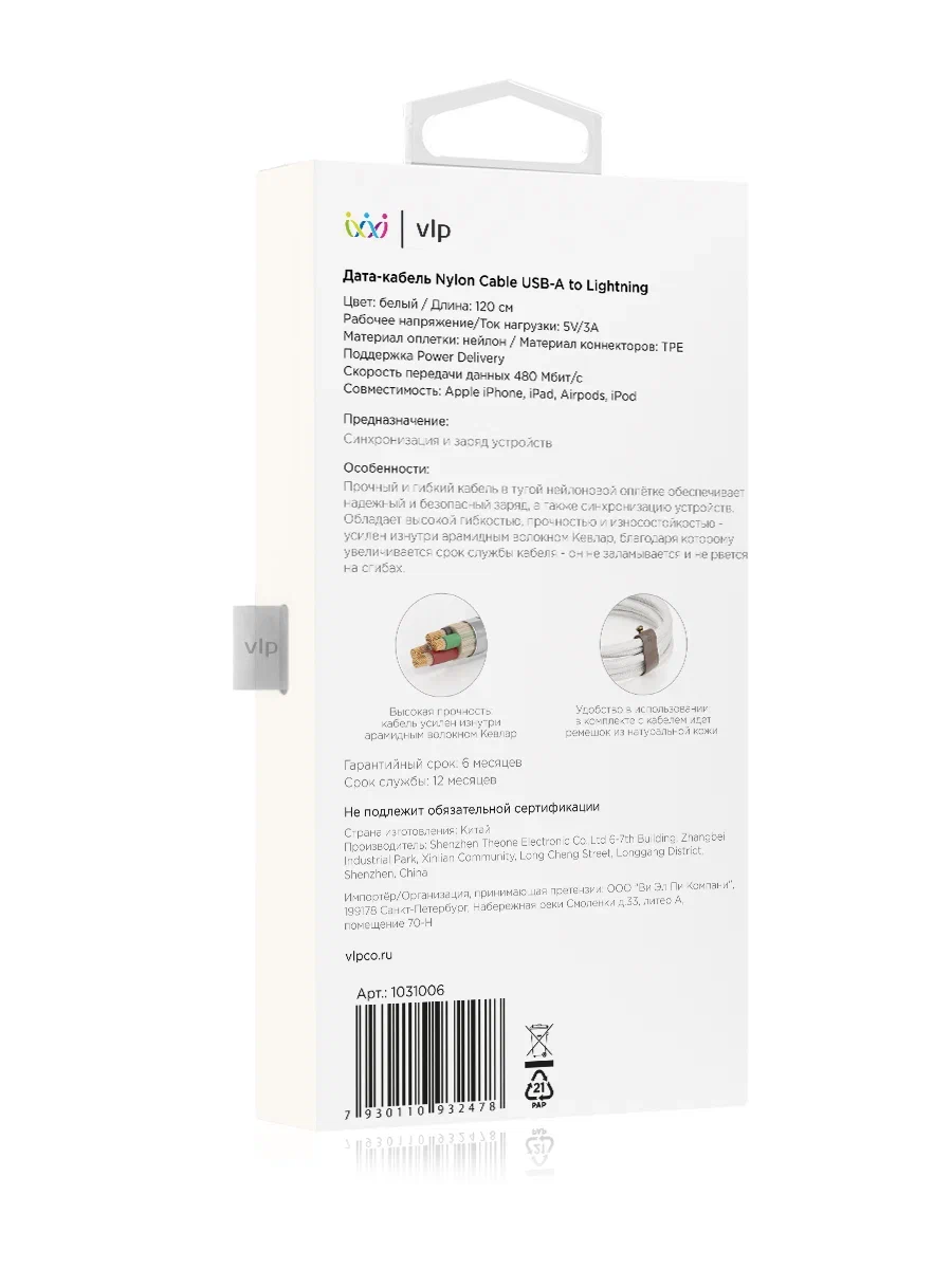 Зарядный провод "vlp" Nylon Cable USB C - Lightning MF 1.2м, белый